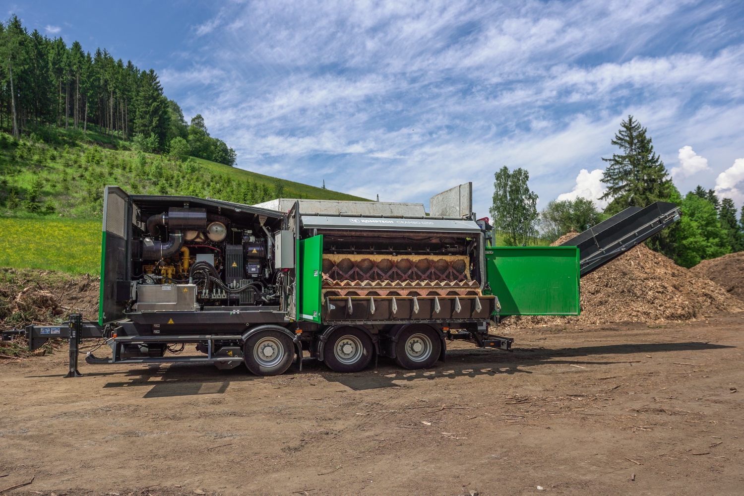 In the extra-large shredding chamber, two 2.8 m counterrotating toothed drums ensure positive feed. From bulky branches and cuttings to rootstocks of any size to used wood contaminated with contraries, it shreds everything down to a defined particle size.